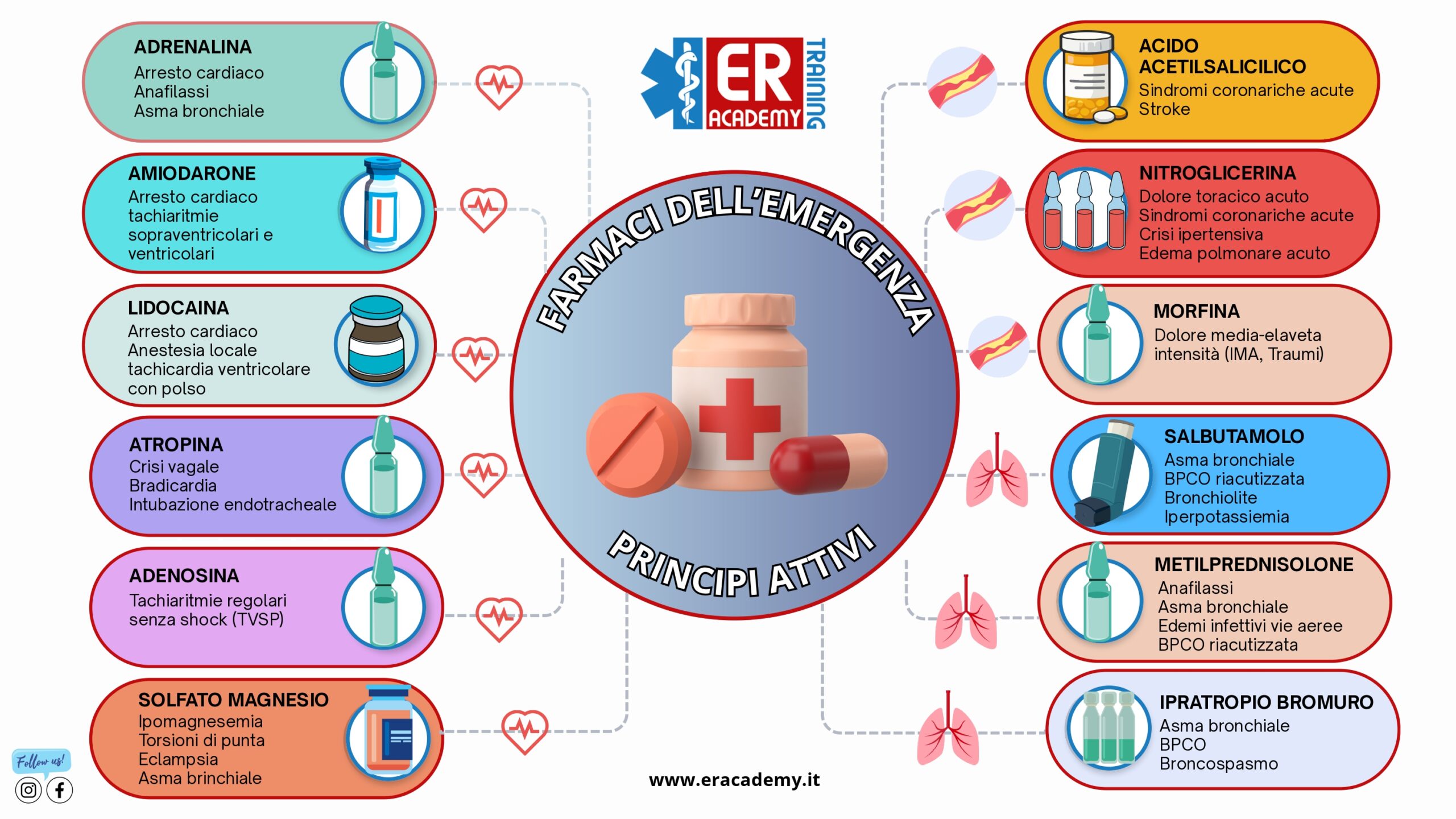 - Controindicazioni: nessuna assoluta nelle emergenze salvavita; cautela in tachiaritmie, cardiopatia ischemica